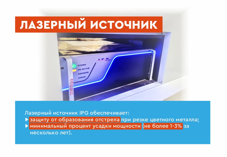 1) Ультра производительным излучателем премиального уровня IPG (Россия). Для резки цветных металлов, черной и нержавеющей стали.