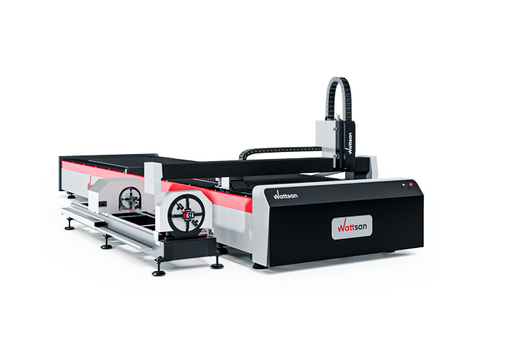 Лазерный станок Wattsan 1530S ROTATORY TABLECHANGE — металлорез 2 в 1: резка листового металла и труб. На одной платформе объединены труборезный модуль для обработки квадратных (от 10 до 140 мм) и круглых труб ( от 10 до 220 мм ), а также стол для резки листа 1500 на 3000 мм.