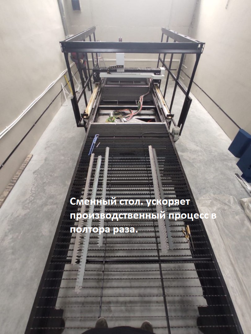 Сменный стол позволяет осуществить непрерывную работу станка 24/7 и не тратить время работы станка на загрузку и выгрузку изделий. Пока на одном столе режется лист металла на втором — оператор собирает готовые изделия и подготавливает следующий лист. Это экономит время и повышает эффективность работы.