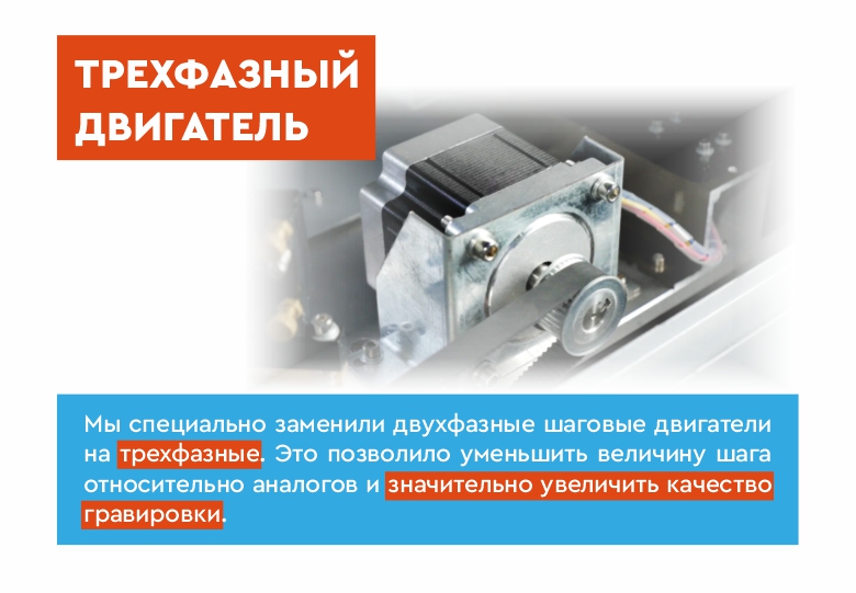 Мы специально заменили двухфазные шаговые двигатели на трехфазные. Это позволило уменьшить величину шага относительно аналогов и значительно увеличить качество гравировки, а также улучшить плавность хода, что особенно актуально при резке акрила и толстой фанеры.