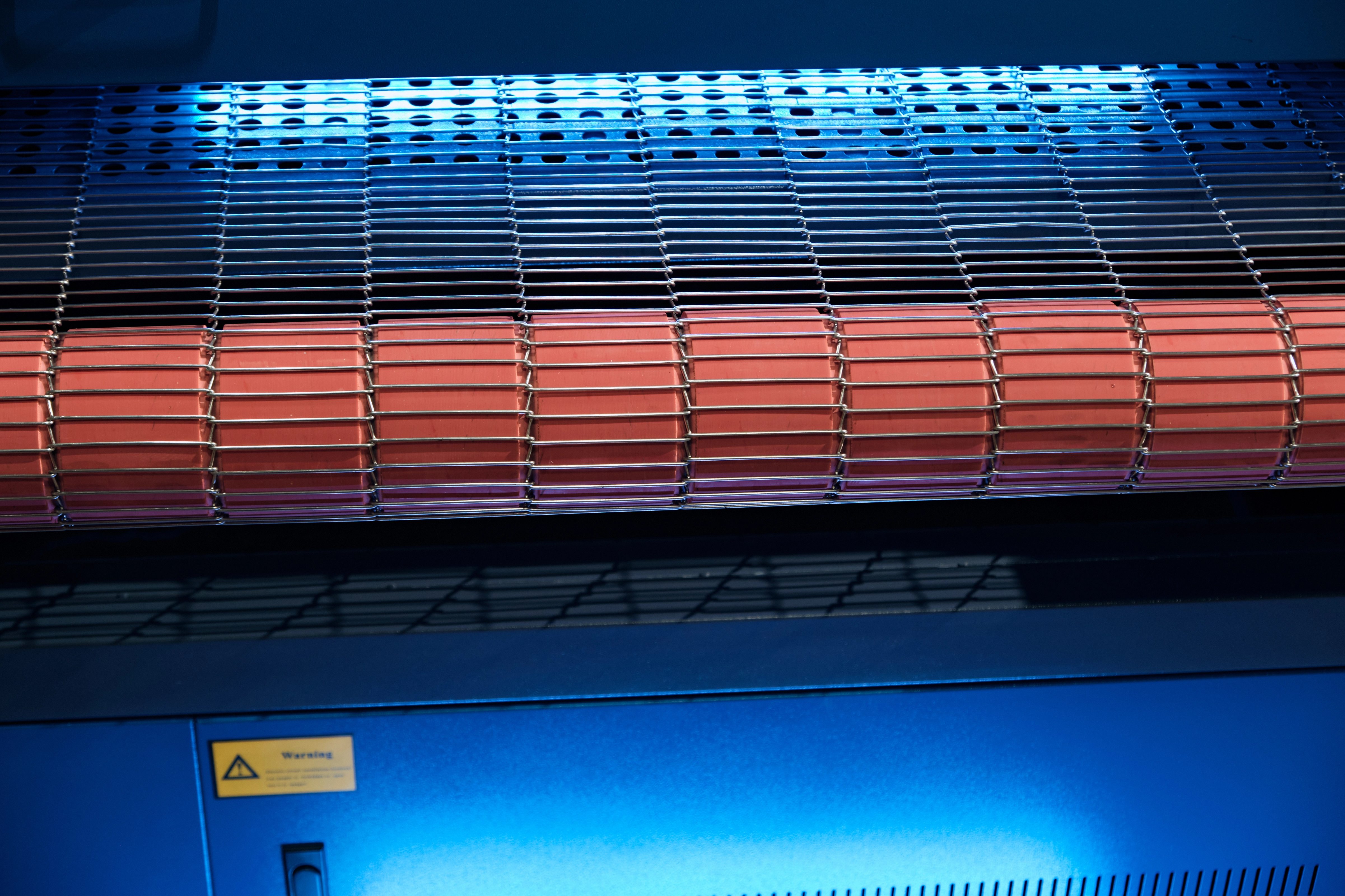 Далее ткань автоматически распределяется по сетке конвейерного стола.