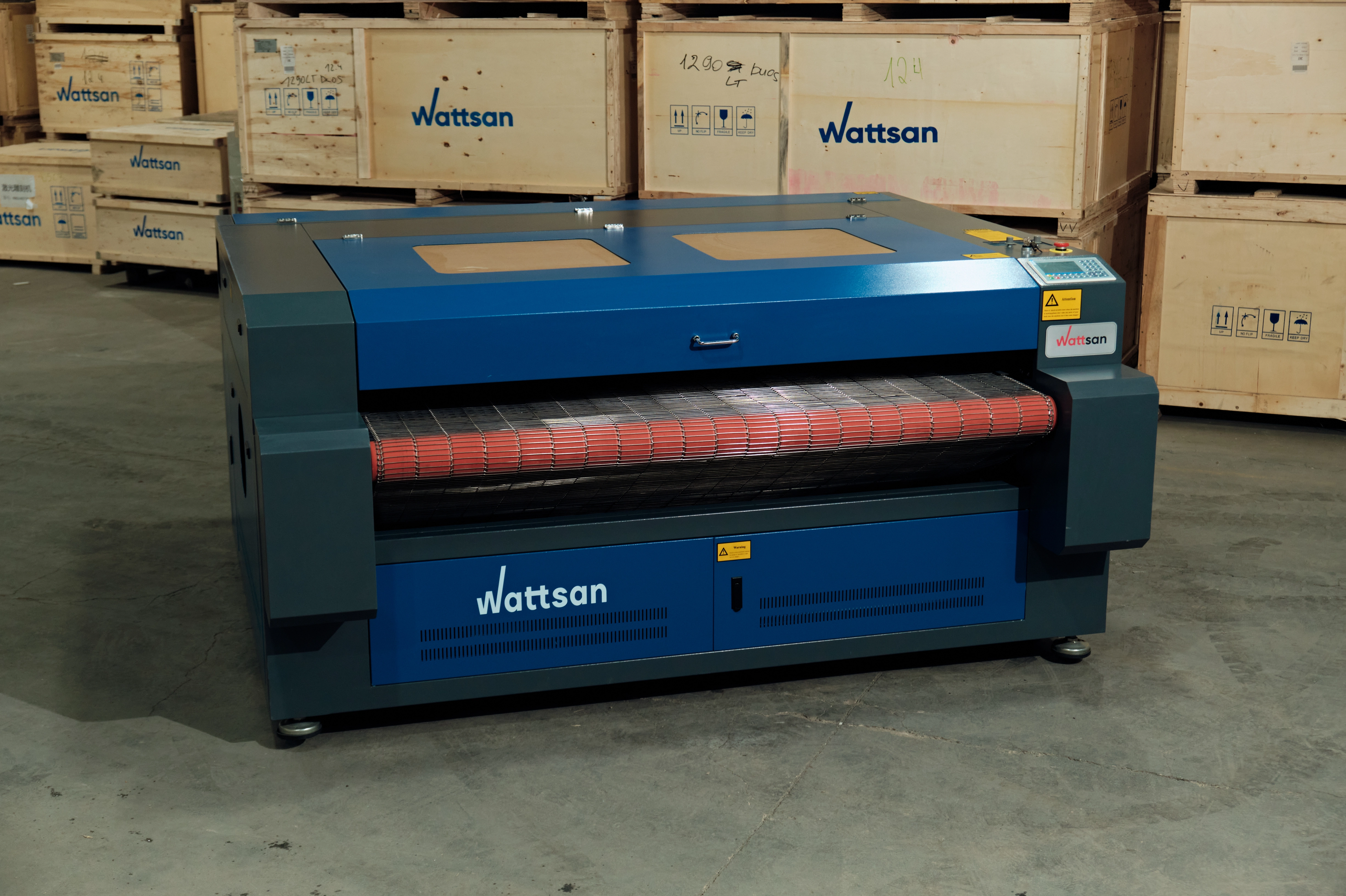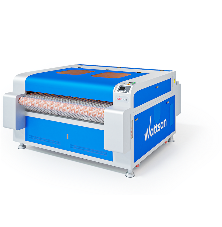 Среднеформатный лазерный станок WATTSAN 1610 Duos conveyer предназначен для потокового раскроя ткани, кожи, кожзама и других рулонных материалов.