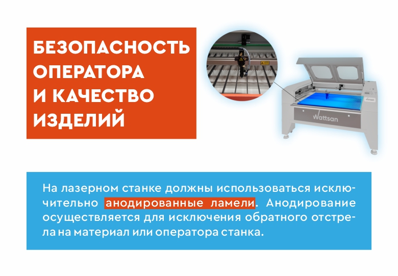 На лазерном станке должны использоваться исключительно анодированные ламели. Ламели предотвращают отстрел лазерного луча, что повышает качество обработки.