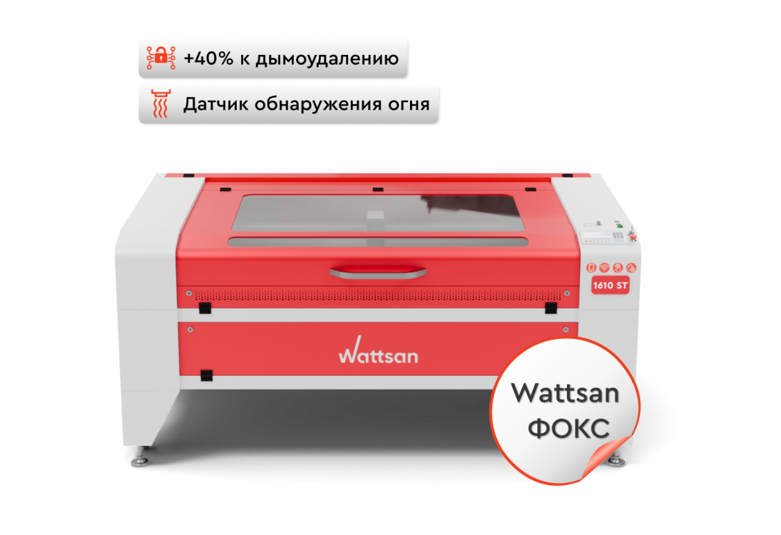 Wattsan 1610 ST — универсальный CO2 станок для резки и гравировки с рабочим полем 1600x1000 мм. Позволяет резать большинство материалов без дополнительного раскроя, экономя время и снижая издержки.