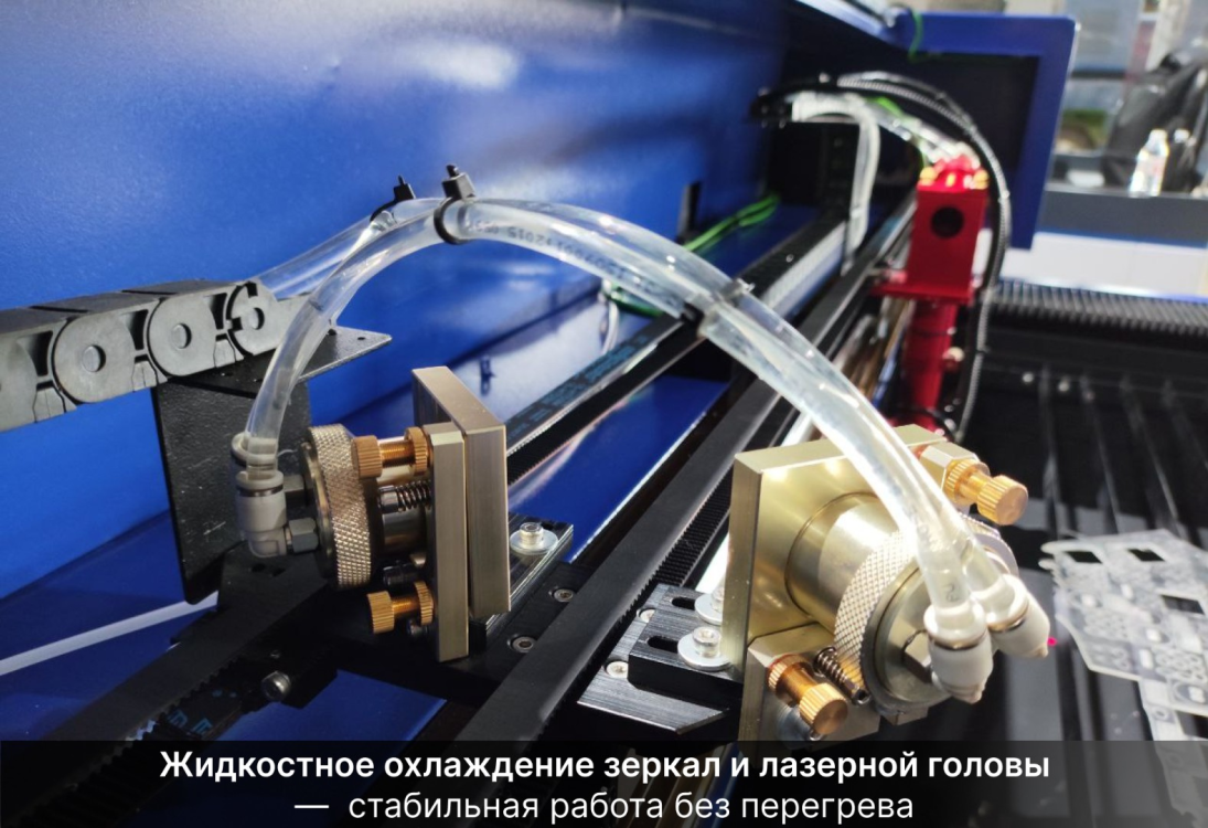 - Водяное охлаждение зеркал и лазерной головы, а также система подготовки воздуха обеспечивают стабильную работу. Зеркала, которые перемещаются вместе с лазерной головой, исключают потерю мощности лазерного луча и обеспечивают высокую точность.