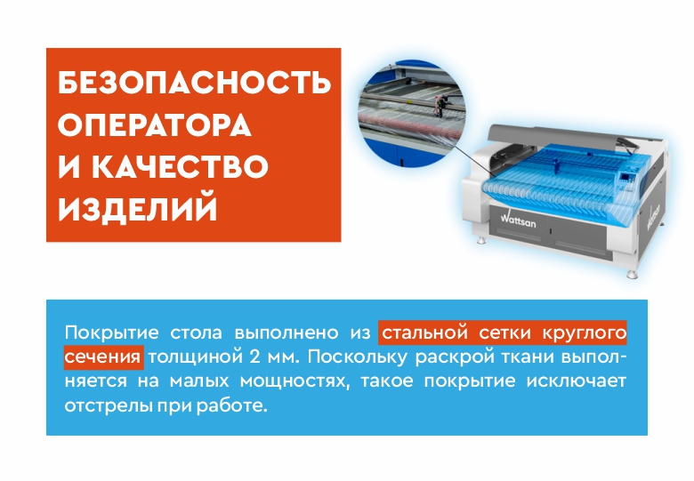 Повышенная выработка производства, по сравнению с аналогами, и возможность единовременной обработки большого количества материала — основные плюсы этого станка, благодаря сочетанию конвейерного механизма и большой площади рабочего стола. Лазерная резка ткани обеспечивает аккуратные, без дополнительной обработки ровные торцы. Также станок режет мех и другие материалы, не повреждая ворс.